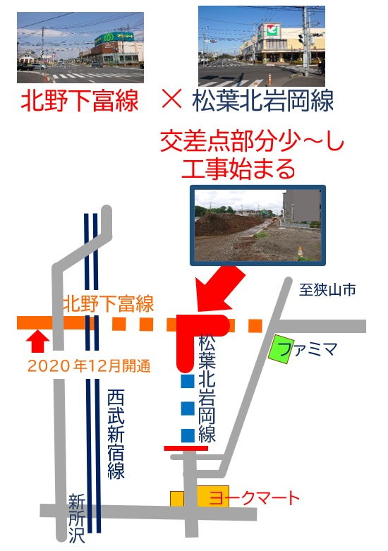 2021年5月情報 所沢北野下富線×松葉北岩岡線 交差点部分少〜しだけ工事始まる