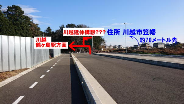 住所としてはこの先約70メートルで川越市笠幡に