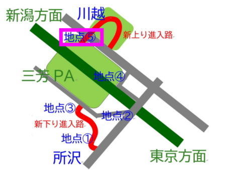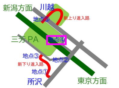 2021年8月 地点@ 下り(新潟・圏央道)方面入口予定箇所 ![]() この場所は所沢航空公園から17分ほどの 多聞院交差点から奥に行ったところにある 関越自動車道の下り(新潟・圏央道)方面の 入口予定になる箇所になります 2年〜3年前に歩道が整備され何の動きだろうと 思っていましたが最近、この箇所の工事を発見 これはもしかしてICフル化のための工事では ないかと思い様々調べたところ フル化整備の工事が始まったことを知りました ![]() 工事看板も設置されておりました ![]() 2年〜3年前に整備された歩道 この周辺は川越いもの一大産地で有名な場所で 超広大な さつまいも畑が広がる地域であります 地点A 現下り(新潟・圏央道)方面入口手前 ![]() この関越を渡る陸橋手前左に入りますと 現在の関越自動車道スマートインター下り(新潟・圏央道) 方面へ行くことができます なるほど中型車も入ることができないのですね こちらの陸橋も歩道が整備されていないため 今回の工事により歩道が設置されるそうです 道路環境が良くなりますね ![]() 外から三芳PAを見た様子 地点B現下り(新潟・圏央道)方面入口 ![]() ![]() 地点B現下り(新潟・圏央道)方面入口 こちらが三芳PA内にある下り(新潟・圏央道方面)の スマートIC入口になります こう見ていますと結構な量の乗用車が入っていきます 新設される下り(新潟・圏央道)方面出入口進入路 ![]() 現在の下り入口から右を見ると新設される 進入路が現れます 所沢市街地から近い所に東京方面からの出口が 実現することになります楽しみですね 画像から見ると砂利しか見えませんが 向かって右側の側溝がほぼ完成しております 地点C現上り(東京方面)出口 ![]() ![]() こちらが現上り(東京方面)出口になります ここから東京方面に入ることはできません 現時点では新潟・圏央道方面から 出ることしかできません 地点D 新上り(東京方面)出入り口予定地 ![]() ![]() 三芳PA内にある東京方面出入口に通じる 進入路予定地になります 三芳PA外からの徒歩用出入り口 ![]() 実は三芳PAは徒歩で上り車線側は入る ことができ、産直野菜などが販売され 多くの地元の人々が日常的に利用され ているようです 今回は建設予定地取材のため始めて 入っていみました 三芳PAの様子 ![]() 上り(東京方面)出入口外の現場の様子 ![]() ![]() ![]() 現在このように整備が進められております 順調に整備されるよう期待しております YouTube映像版はこちら ![]() 三芳スマートインターフル化概要 |